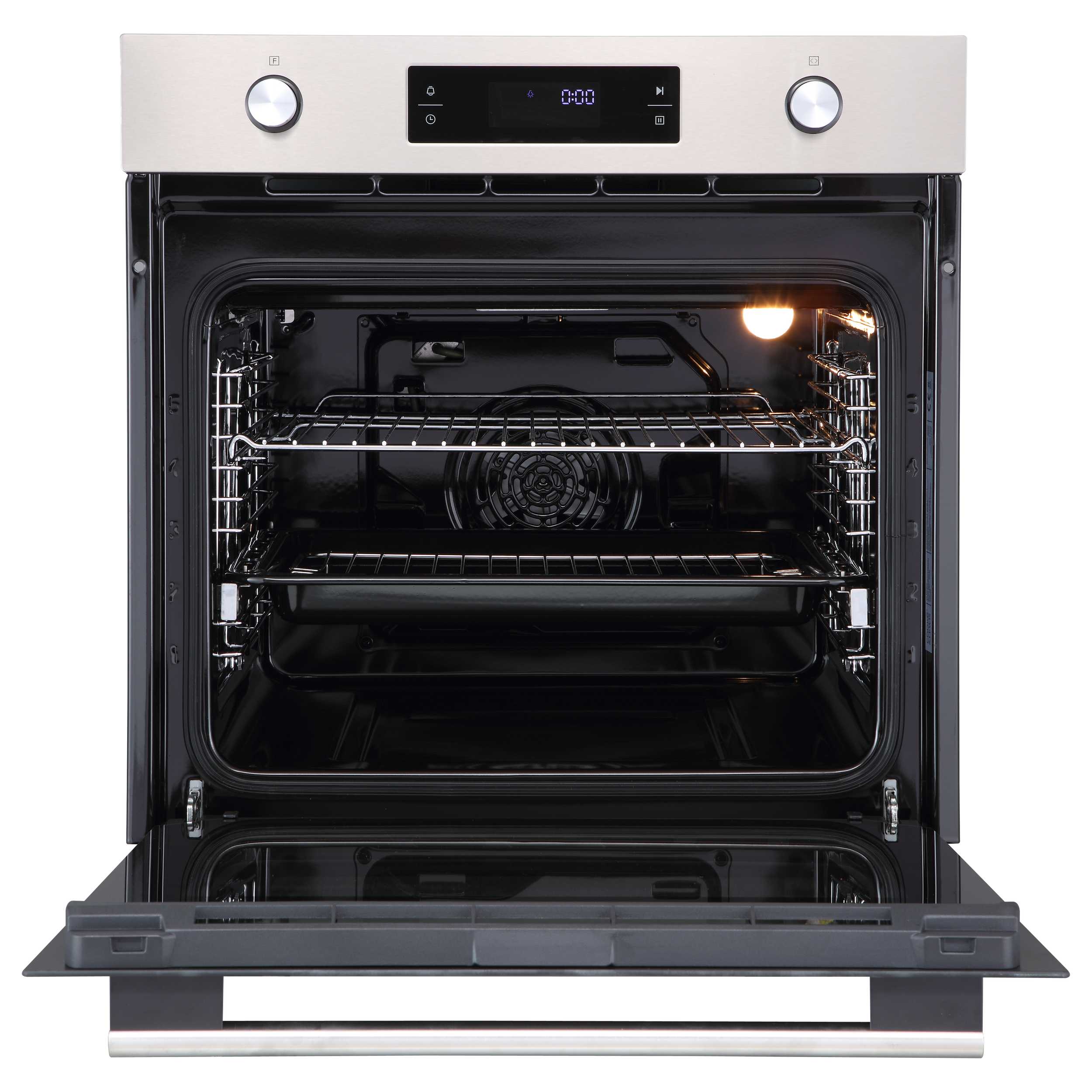 духовой шкаф встраиваемый полноразмерный, 60 см, 9 режимов, объем духовки 70л, утапливаемые переключатели, большой дисплей Snow White, хромированные боковые решетки, телескопические направляющие 1 уровень, панель управления - нержавеющая сталь, универсальный противень, решетка-гриль, тройное стекло дверцы, легко-съемное большое внутреннее стекло Full Glass, защитное отключение, охлаждающий вентилятор, электронный таймер 9 часов, 595х575х595 мм