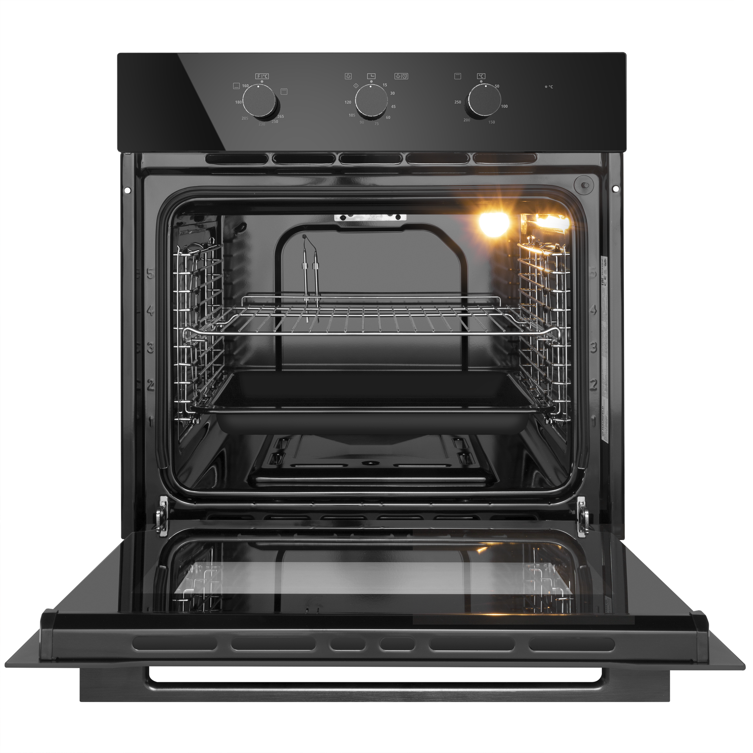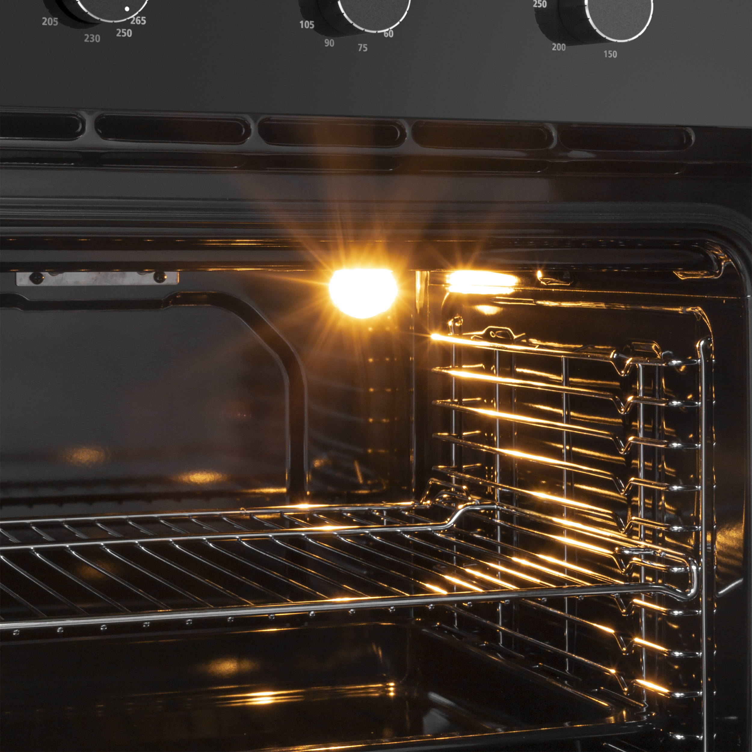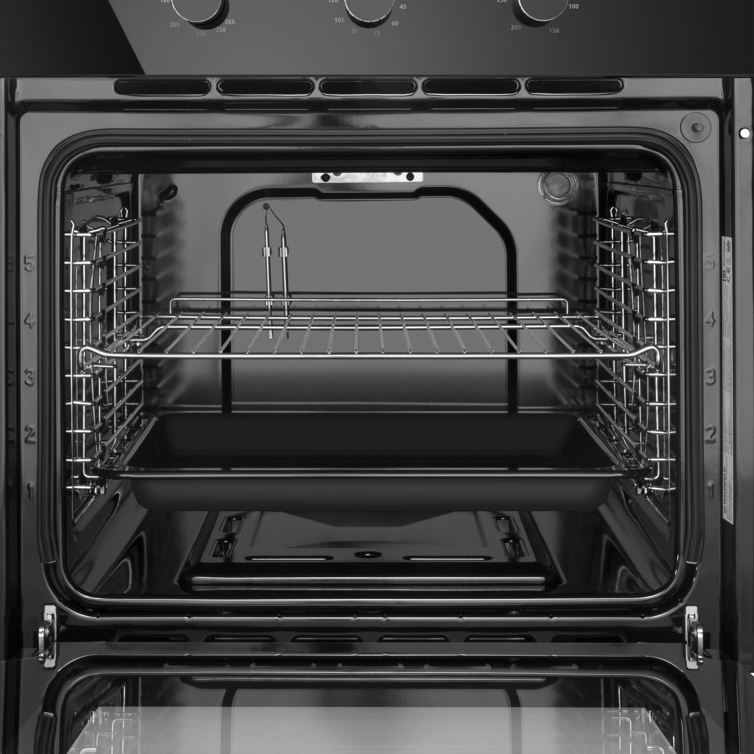 Объем 70 л при стандартной ширине 60 см позволяет готовить одновременно несколько блюд, разместив решетку или противень на одном из 5-ти уровней боковых направляющих. Внутреннее покрытие камеры выполнено из специальной легкоочищающейся эмали черного цвета.