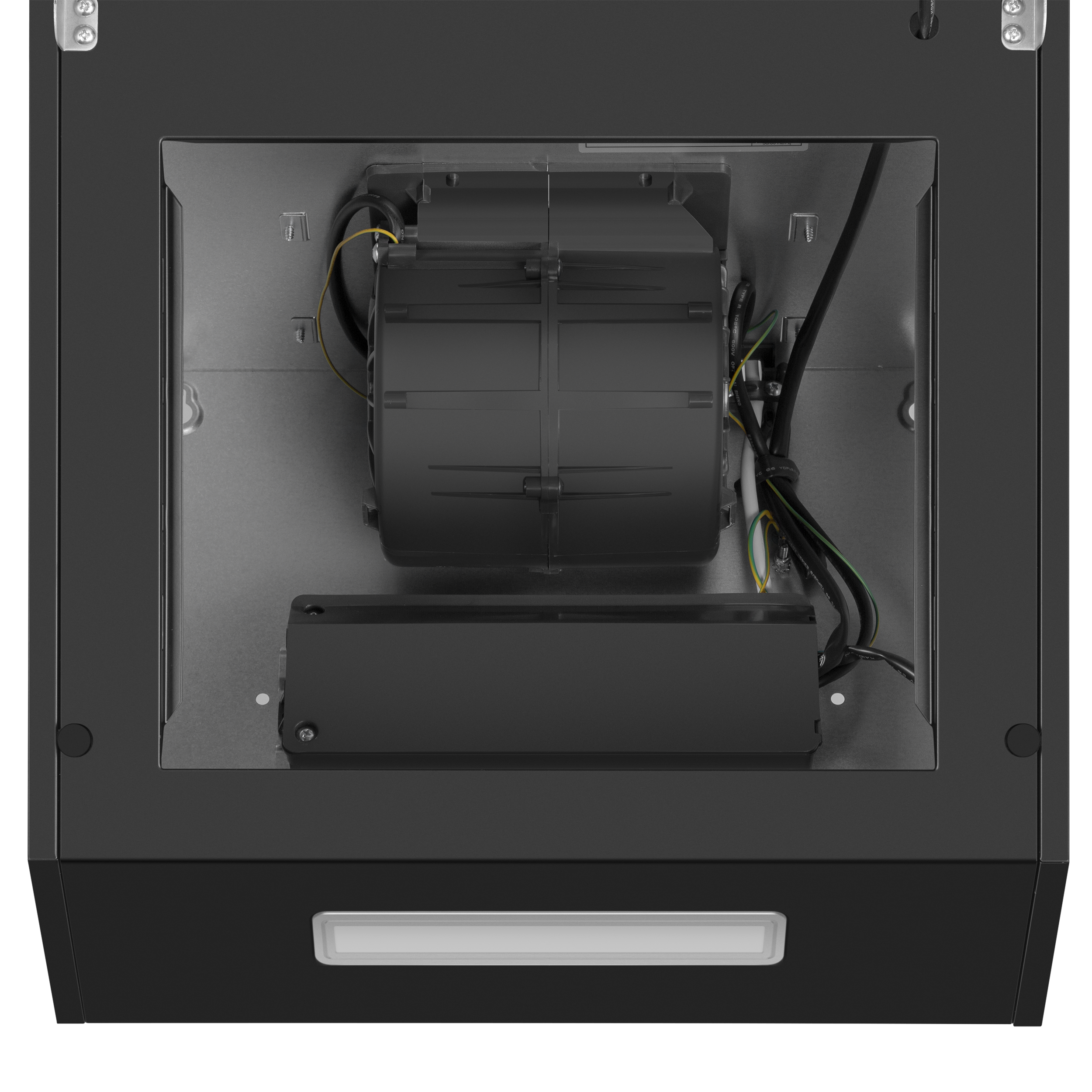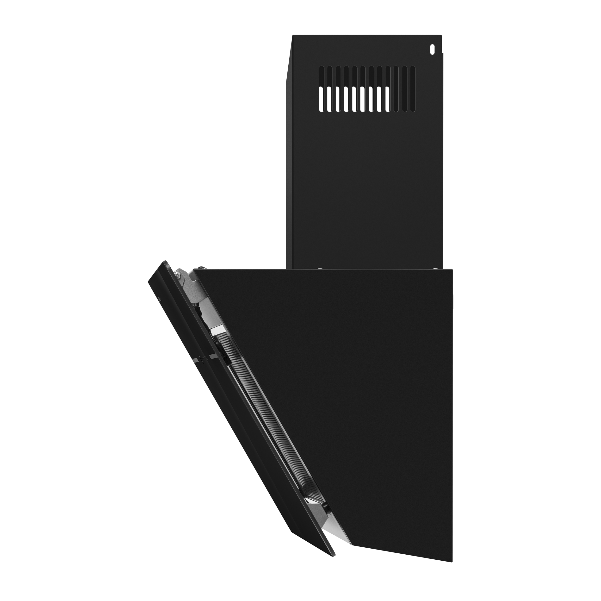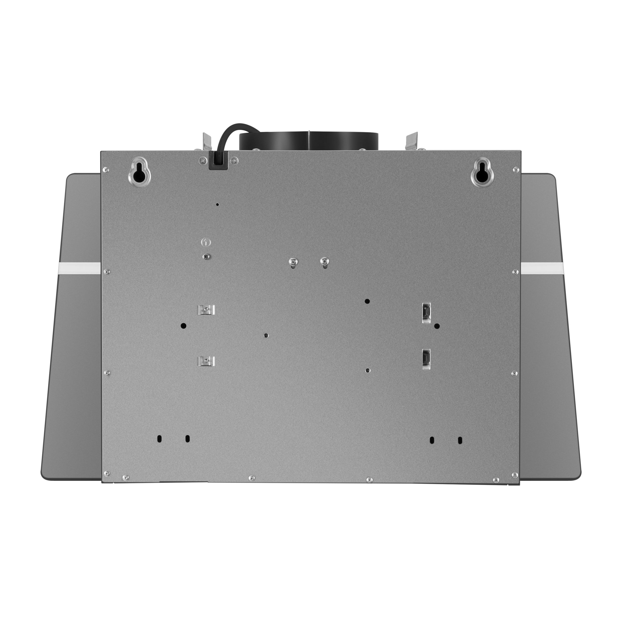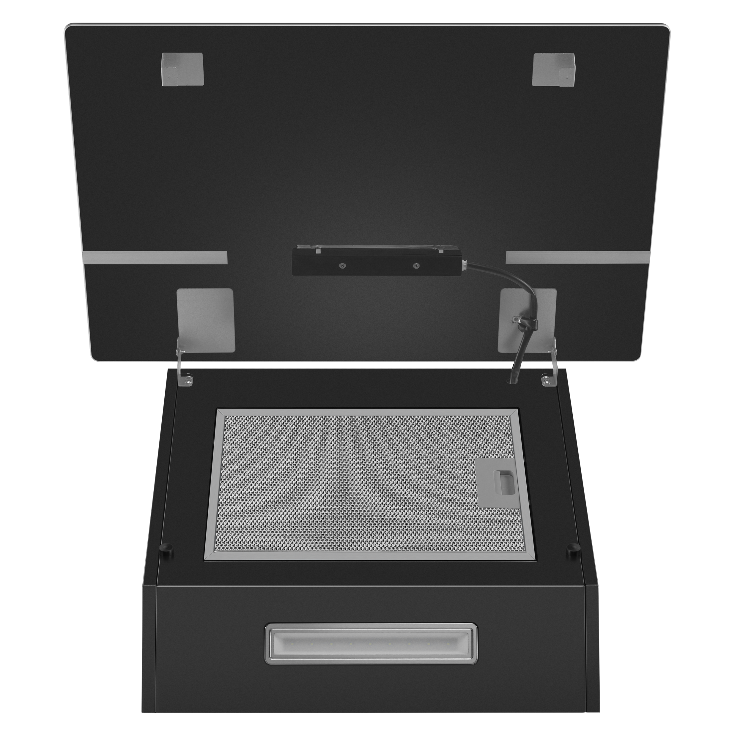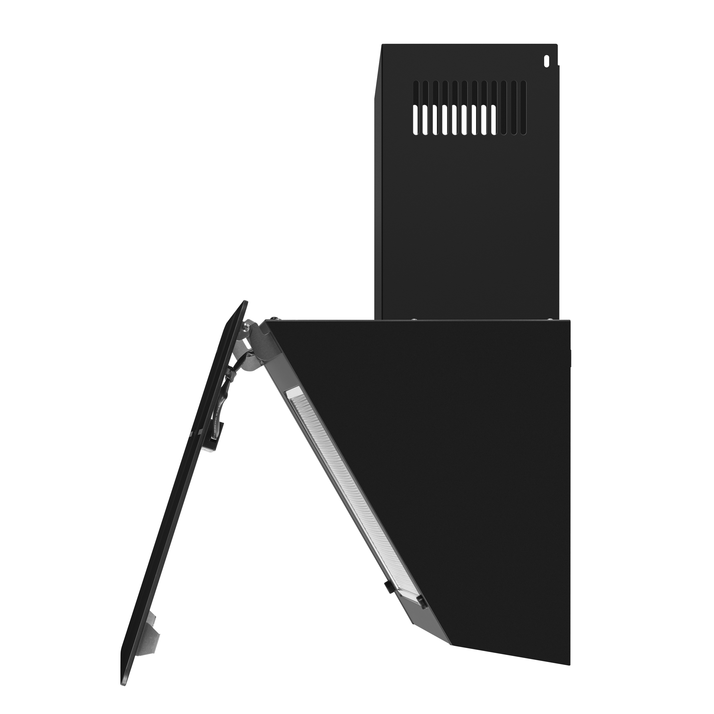 Корпус сделан из эмалированной стали. Фасад выполнен полностью из закаленного стекла . За ней скрыт алюминиевый жироулавливающий фильтр, который легко снимается и полностью разбирается для чистки. Загрязненный воздух втягивается по периметру откидной панели.